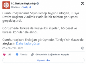 Cumhurbaşkanlığı İletişim Başkanlığı tarafından yapılan açıklamaya göre, Cumhurbaşkanı Erdoğan ve Rusya Devlet Başkanı Putin, Türkiye-Rusya ilişkilerinin yanı sıra Gazze’deki insani kriz ve Ukrayna-Rusya savaşındaki son gelişmeleri de değerlendirdi.